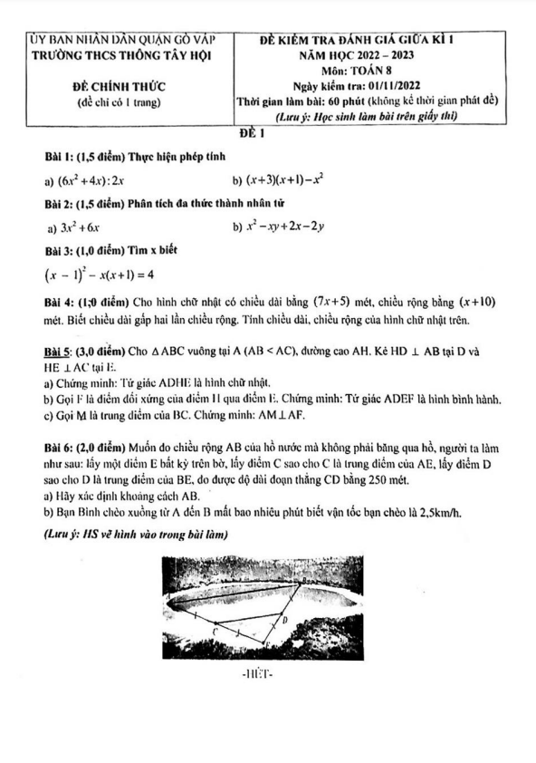 Đề thi giữa học kì 1 (HK1) lớp 8 môn Toán năm 2022-2023 trường THCS Thông Tây Hội TP HCM