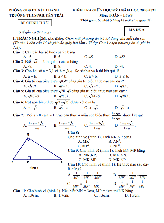Đề giữa HK1 Toán 9