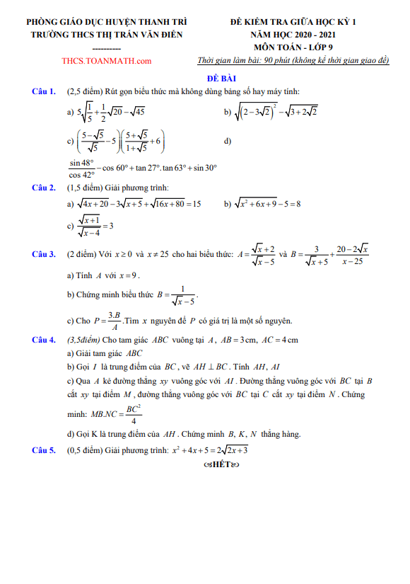 Đề thi giữa học kì 1 (HK1) lớp 9 môn Toán năm 2020 2021 trường THCS thị trấn Văn Điển Hà Nội