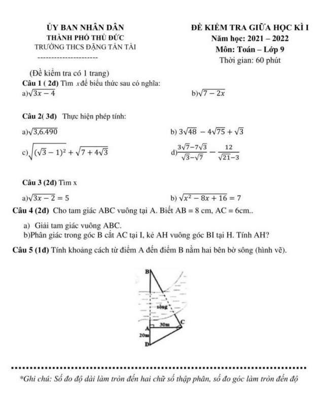 Đề thi giữa học kì 1 (HK1) lớp 9 môn Toán năm 2021-2022 trường THCS Đặng Tấn Tài TP HCM