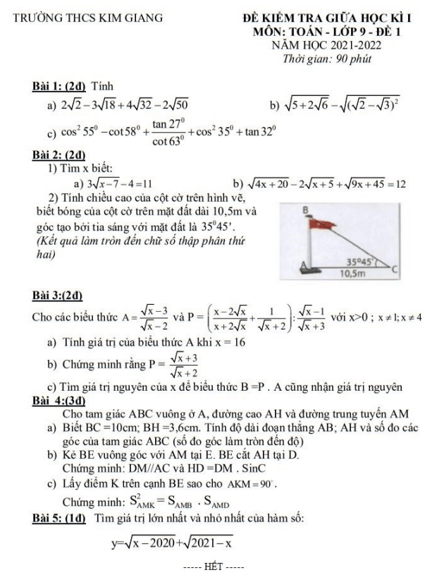 Đề thi giữa học kì 1 Toán lớp 9 năm 2021 – 2022 trường THCS Kim Giang – Hà Nội