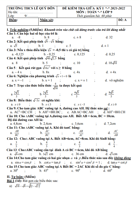 Đề thi giữa học kỳ 1 Toán lớp 9 năm 2021 – 2022 trường THCS Lê Quý Đôn Quảng Nam