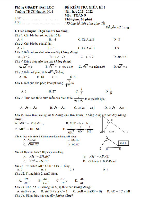 Đề thi giữa kì 1 Toán lớp 9 năm 2021 – 2022 trường THCS Nguyễn Huệ – Quảng Nam