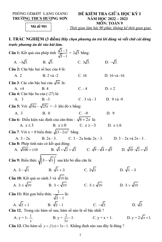 Xin chào quý thầy cô và các em học sinh lớp 9! Dưới đây là đề kiểm tra chất lượng giữa học kỳ 1 môn Toán lớp 9 năm học 2022 – 2023 tại trường THCS Hương Sơn, huyện Lạng Giang, tỉnh Bắc Giang. Đề thi này được biên soạn theo cấu trúc bao gồm 30% câu hỏi trắc nghiệm và 70% câu hỏi tự luận (điểm số được ghi rõ), thời gian làm bài là 90 phút, không tính thời gian giao đề. Đề thi có đáp án và hướng dẫn giải mã cho câu 901 và 902.