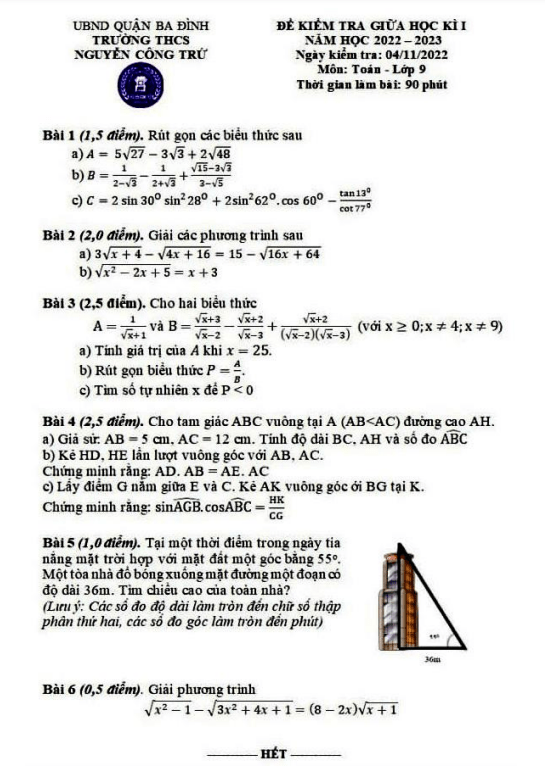 Đề thi giữa học kì 1 (HK1) lớp 9 môn Toán năm 2022-2023 trường THCS Nguyễn Công Trứ Hà Nội