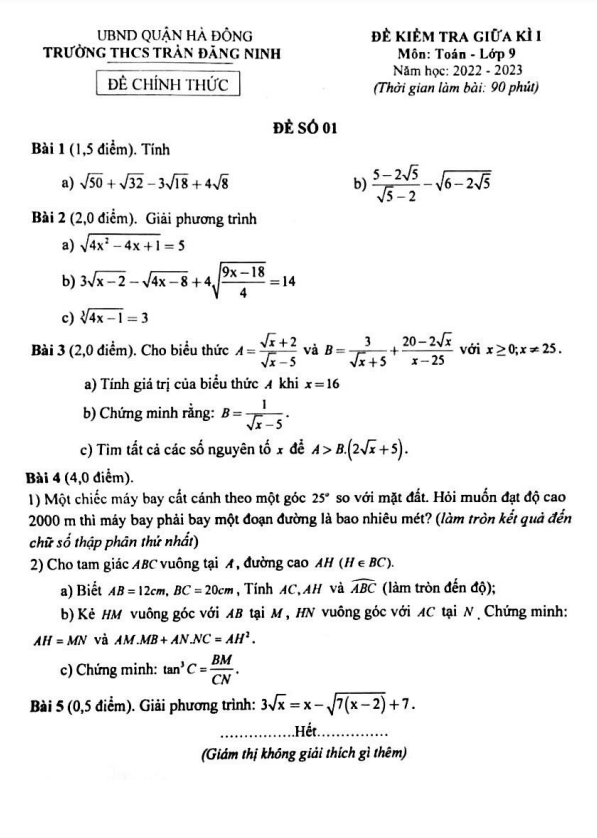 Đề thi giữa học kì 1 (HK1) lớp 9 môn Toán năm 2022 2023 trường THCS Trần Đăng Ninh Hà Nội