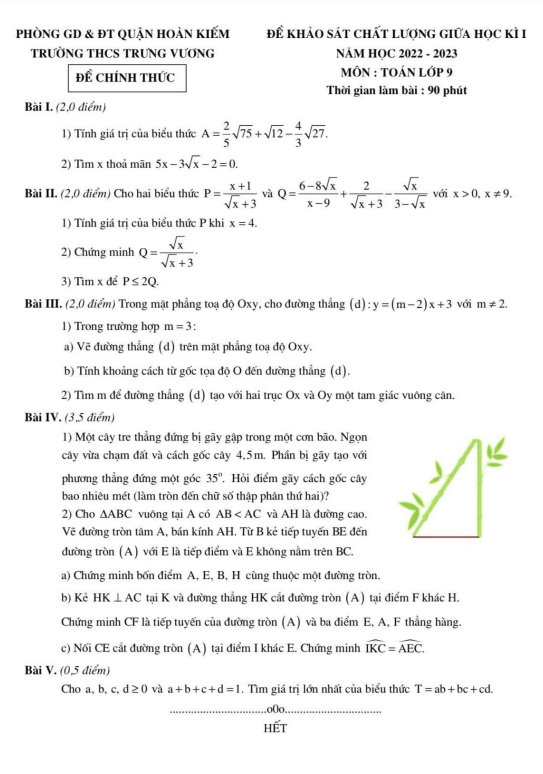 Đề thi giữa học kì 1 (HK1) lớp 9 môn Toán năm 2022 2023 trường THCS Trưng Vương Hà Nội