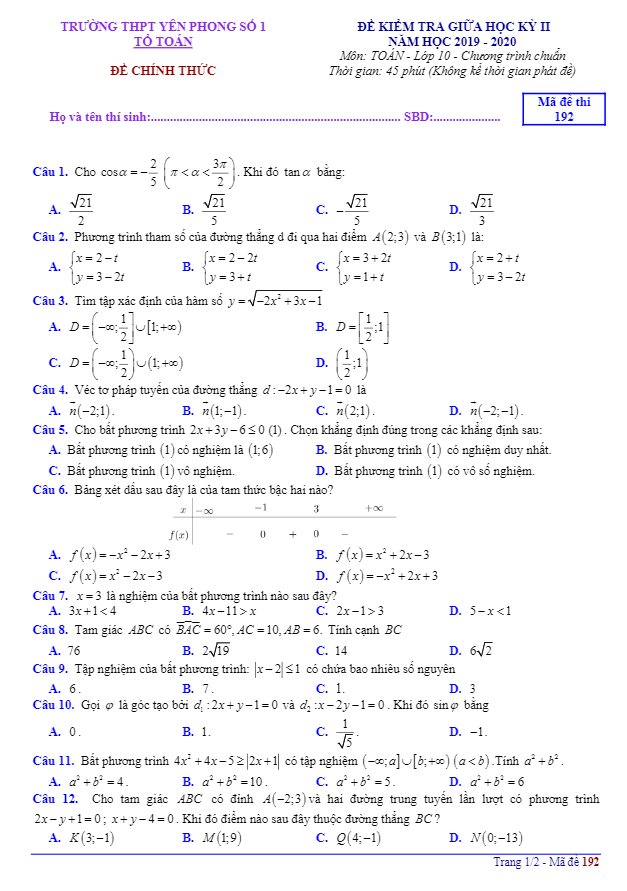 Đề thi giữa học kì 2 (HK2) lớp 10 môn Toán năm 2019 2020 trường THPT Yên Phong 1 Bắc Ninh
