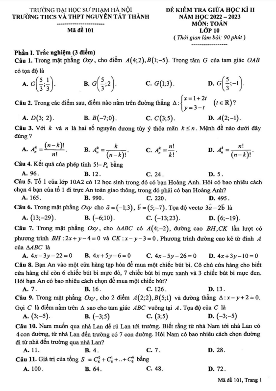 Đề thi giữa học kì 2 (HK2) Toán lớp 10 năm 2022 – 2023 trường Nguyễn Tất Thành Hà Nội