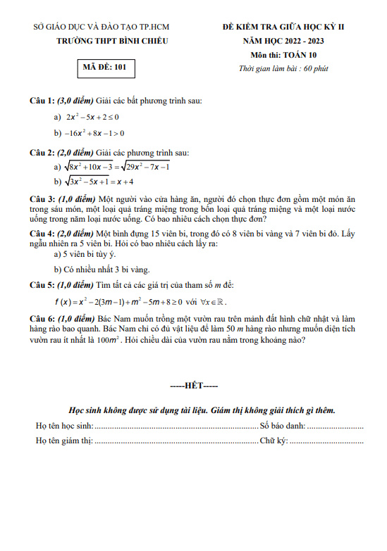 Chào quý thầy cô và các em học sinh lớp 10! Để hỗ trợ các em chuẩn bị cho kỳ thi giữa học kỳ 2 môn Toán, Sytu xin giới thiệu đến đề thi kiểm tra chất lượng từ trường THPT Bình Chiểu, thành phố Hồ Chí Minh.