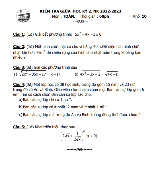 Sytu xin giới thiệu đến toàn thể thầy cô và các em học sinh lớp 10 đề kiểm tra giữa học kỳ 2 môn Toán năm học 2022-2023 tại trường THPT Gia Định, thành phố Hồ Chí Minh.