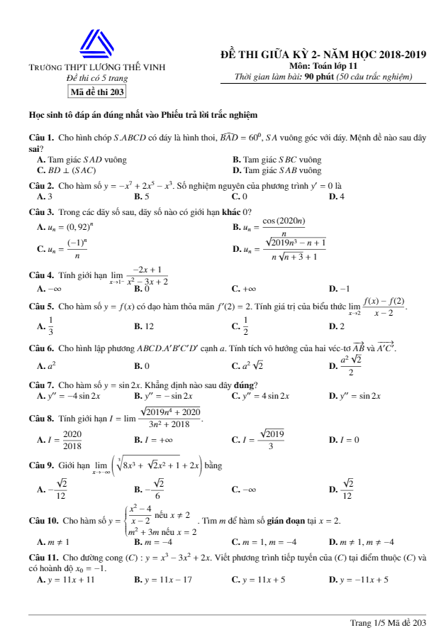 Đề thi giữa kỳ 2 Toán lớp 11 năm học 2018 – 2019 của trường Lương Thế Vinh – Hà Nội là một bài kiểm tra đa dạng và mang tính chất thử thách. Bao gồm 04 mã đề, các câu hỏi và bài tập được biên soạn theo hình thức trắc nghiệm khách quan với tổng cộng 50 câu hỏi. Thời gian làm bài là 90 phút, đề thi kéo theo phần đáp án để học sinh tự kiểm tra kết quả.