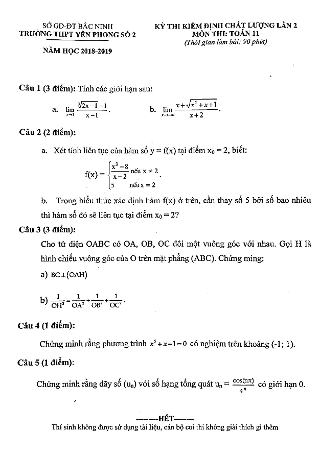 Đề thi giữa kì 2 Toán lớp 11 năm học 2018 – 2019 của trường Yên Phong 2 – Bắc Ninh là cơ hội để học sinh thử thách và củng cố kiến thức một cách sâu sắc. Hy vọng các em sẽ làm tốt trong kỳ thi này!
