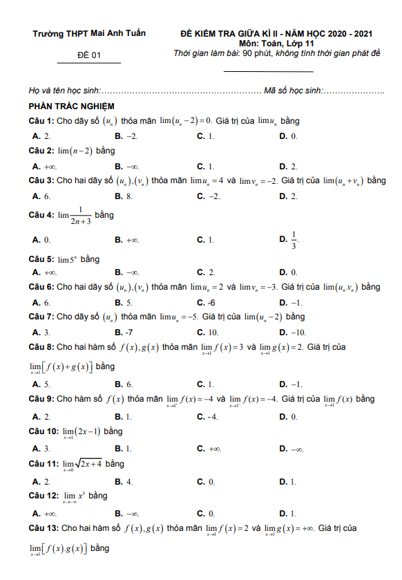 Đề thi giữa học kì 2 Toán lớp 11 năm 2020 – 2021