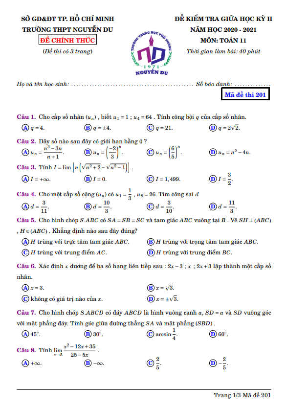 Xin chào quý thầy cô và các em học sinh lớp 11! Hôm nay Sytu xin giới thiệu đề thi giữa kỳ 2 môn Toán năm học 2020 – 2021 của trường THPT Nguyễn Du, quận 10, thành phố Hồ Chí Minh.
