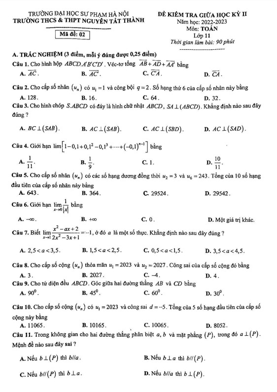 Đề thi giữa học kì 2 (HK2) môn Toán lớp 11 năm 2022 – 2023 trường Nguyễn Tất Thành Hà Nội