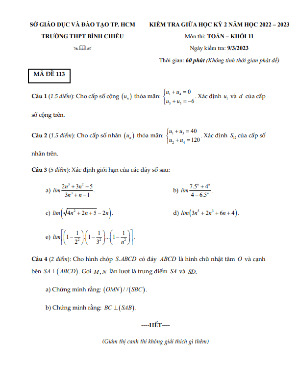 Xin chào quý thầy cô và các em học sinh lớp 11! Trong đề kiểm tra chất lượng giữa học kỳ 2 môn Toán lớp 11 năm học 2022 – 2023 tại trường THPT Bình Chiểu, chúng ta sẽ có cơ hội thử thách kiến thức và kỹ năng của mình thông qua đề thi được biên soạn hoàn toàn theo hình thức tự luận, gồm 04 câu hỏi và bài toán. Thời gian làm bài là 60 phút, đề thi có đáp án, lời giải chi tiết và hướng dẫn chấm điểm mã đề 113 – 114.