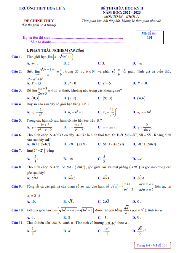 Đề thi Toán lớp 11 môn Toán năm 2022 – 2023 của trường THPT Hoa Lư A – Ninh Bình sẽ là bước thử thách thú vị để kiểm tra kiến thức của các bạn học sinh. Hãy cố gắng và tự tin làm bài để đạt kết quả tốt nhé!