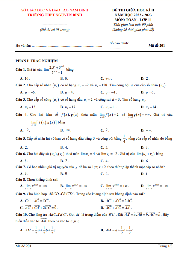 Đề thi giữa học kì 2 môn Toán lớp 11 năm học 2022 – 2023 trường THPT Nguyễn BínhTrước hết, Sytu xin được giới thiệu đến quý thầy cô và các em học sinh lớp 11 đề thi khảo sát chất lượng giữa học kì 2 môn Toán năm học 2022 – 2023 của trường THPT Nguyễn Bính, tỉnh Nam Định. Đề thi sẽ bao gồm 50% câu hỏi trắc nghiệm và 50% câu hỏi tự luận, thời gian làm bài là 90 phút (không tính thời gian phát đề). Đề thi sẽ có đáp án và lời giải chi tiết mã đề số từ 201 đến 208.Một trong những câu hỏi trong đề thi là về việc chọn phương án lương tối ưu cho Anh Bình khi ký hợp đồng làm việc trong 3 năm. Anh có hai phương án để chọn lựa. Phương án 1 là mức lương ổn định là 8 triệu đồng/tháng, trong khi phương án 2 có mức lương khởi điểm là 6 triệu đồng/tháng và được tăng 300,000 đồng mỗi tháng kể từ năm thứ hai. Học sinh cần phải suy tính để chọn ra phương án nào sẽ mang lại tổng số tiền lương lớn hơn sau 3 năm làm việc.Một câu hỏi khác liên quan đến hình chóp S.ABCD có đáy là hình chữ nhật. Học sinh sẽ phải chứng minh và tính góc giữa hai đường thẳng, tính góc giữa đường thẳng và mặt phẳng, từ đó đưa ra câu trả lời chính xác.Còn một câu hỏi khác đề cập đến tứ diện OABC, học sinh sẽ phải tìm độ dài đoạn từ điểm H đến O trong mặt phẳng ABC, dựa vào các thông tin đã được cung cấp.Những câu hỏi này sẽ giúp học sinh thực hành và củng cố kiến thức Toán một cách chi tiết và logic. Chúc quý thầy cô và các em học sinh chuẩn bị tốt cho đề thi sắp tới!