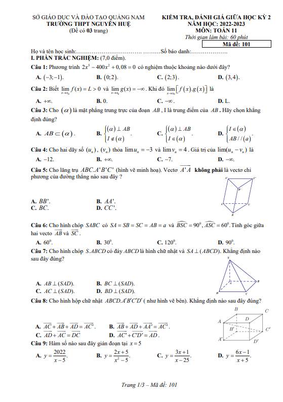 Sytu xin được giới thiệu đến quý thầy cô và các em học sinh lớp 11 đề kiểm tra giữa học kỳ 2 môn Toán năm học 2022 – 2023 của trường THPT Nguyễn Huệ, Quảng Nam. Đề thi bao gồm đáp án trắc nghiệm và hướng dẫn chấm tự luận với mã đề 101, 102, 103, 104, 105, 106, 107, 108.