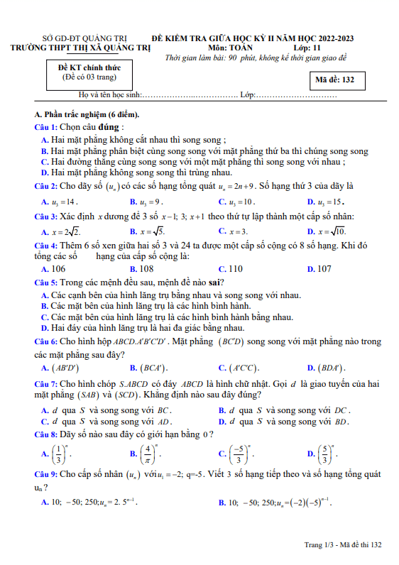 SyTu hân hạnh giới thiệu đến quý thầy cô và các em học sinh lớp 11 đề kiểm tra giữa học kỳ 2 môn Toán lớp 11 năm học 2022-2023 trường THPT Thị xã Quảng Trị, tỉnh Quảng Trị. Đề thi được biên soạn theo cấu trúc 60% trắc nghiệm và 40% tự luận, thời gian làm bài 90 phút, không tính thời gian giao đề. Đề thi bao gồm các mã đề 132, 209, 357, 485, cung cấp đáp án, lời giải chi tiết và hướng dẫn chấm điểm.Trích dẫn từ đề thi gồm các câu hỏi thú vị như sau:1. Nếu người ta thiết kế một cái tháp gồm 11 tầng, với điều kiện diện tích bề mặt trên của mỗi tầng bằng nửa diện tích của mặt trên tầng ngay bên dưới và diện tích mặt trên tầng 1 bằng nửa diện tích của đế tháp, hãy tính diện tích mặt trên cùng của tháp đó.2. Ba số x, y, xy 6, 5, 2, 8 lập thành cấp số cộng và các số x, y, xy 1, 2, 3 lập thành cấp số nhân. Hãy tìm giá trị của x và y.3. Cho hình chóp S ABCD có đáy ABCD là hình chữ nhật, giao tuyến d của hai mặt phẳng (SAB) và (SCD). Khẳng định nào sau đây đúng? A. d qua S và song song với BC. B. d qua S và song song với DC. C. d qua S và song song với AD. D. d qua S và song song với BD.Hãy chuẩn bị tâm thế học tập tốt và trải nghiệm bài thi môn Toán thú vị này nhé! Chúc các em thành công!