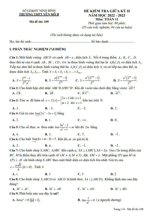 Xin chào quý thầy cô giáo và các em học sinh lớp 11! Hôm nay chúng ta sẽ cùng điểm qua đề kiểm tra giữa học kỳ 2 môn Toán lớp 11 năm học 2022-2023 tại trường THPT Yên Mô B, tỉnh Ninh Bình. Đề thi bao gồm 70% câu hỏi trắc nghiệm (35 câu) và 30% câu tự luận (4 câu), thời gian làm bài là 90 phút. Đề thi có đáp án và lời giải chi tiết với mã đề là 109, 275, 314, 432, 546, 698, 763, 851.
