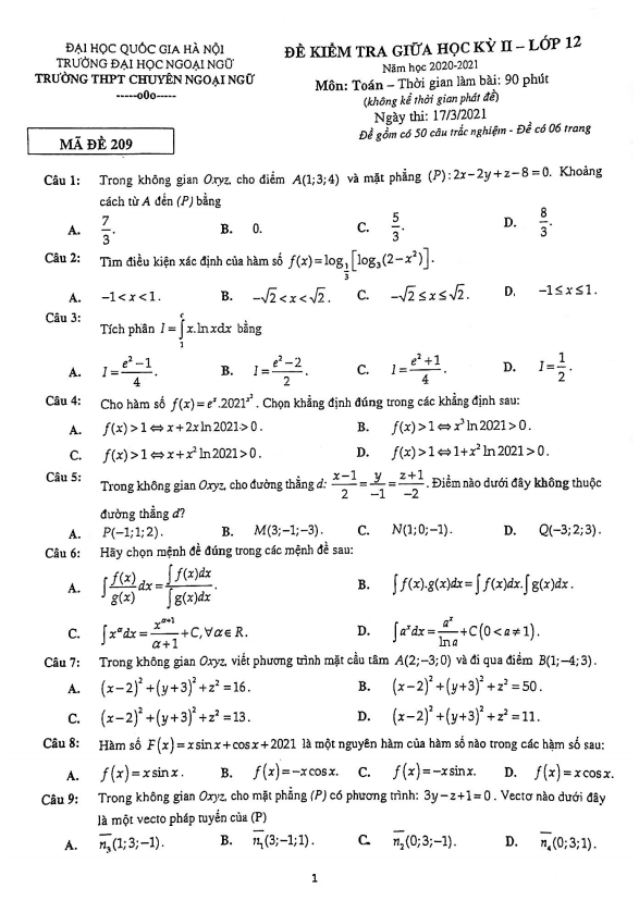 Vào ngày Thứ Tư, ngày 17 tháng 03 năm 2021, trường THPT chuyên Ngoại Ngữ, trường Đại học Ngoại Ngữ, Đại học Quốc gia Hà Nội đã tổ chức kỳ thi kiểm tra giữa học kì 2 môn Toán lớp 12 năm học 2020 – 2021. Đề thi gồm mã đề 209 với tổng cộng 50 câu trắc nghiệm trải dài trên 06 trang. Thời gian làm bài cho bài thi này là 90 phút.