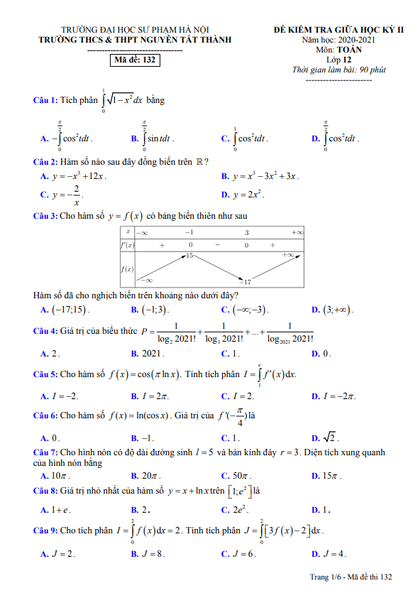 Đề thi giữa học kì 2 (HK2) môn Toán lớp 12 năm 2020-2021 tại trường Nguyễn Tất Thành Hà Nội đã diễn ra vào ngày … tháng 03 năm 2021. Đề thi này được biên soạn theo dạng đề trắc nghiệm, gồm có 50 câu hỏi và bài toán trải đều trên 6 trang. Thời gian làm bài của học sinh là 90 phút.Mỗi bài toán trong đề thi đều được chăm chút và cân nhắc kỹ lưỡng, đảm bảo phù hợp với chương trình học môn Toán lớp 12. Đề thi mẫu đề cung cấp đáp án cho các mã đề là 132, 209, 357, 485 và cung cấp lời giải chi tiết cho một số câu vận dụng cao.Ví dụ về một câu hỏi trong đề thi:” Một người gửi 50 triệu đồng vào ngân hàng theo hình thức lãi kép với lãi suất 5,5%/năm, kỳ hạn 1 năm. Hỏi sau 4 năm người đó rút cả vốn lẫn lãi được số tiền gần với số nào nhất trong các số tiền sau? (Biết lãi suất hàng năm không đổi)”A. 72 triệu đồngB. 61,94 triệu đồngC. 52 triệu đồngD. 63,5 triệu đồngNếu bạn muốn thử sức mình với các bài toán trong đề thi giữa kỳ 2 Toán lớp 12 năm học 2020 – 2021 tại trường Nguyễn Tất Thành Hà Nội, bạn có thể tìm đề thi trên internet để tự kiểm tra kiến thức và kỹ năng của mình. Chúc bạn thành công!