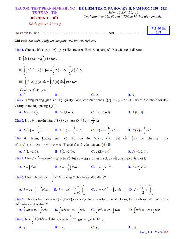Đề thi giữa kỳ 2 môn Toán lớp 12 năm 2020-2021 của trường Phan Đình Phùng Hà Nội có mã đề 147, bao gồm 40 câu hỏi và bài toán trắc nghiệm, được hoàn thiện trên 04 trang giấy. Thời gian làm bài là 60 phút (không tính thời gian nhận đề), và đề thi bao gồm đáp án cho các mã đề 147, 257, 329, 490.