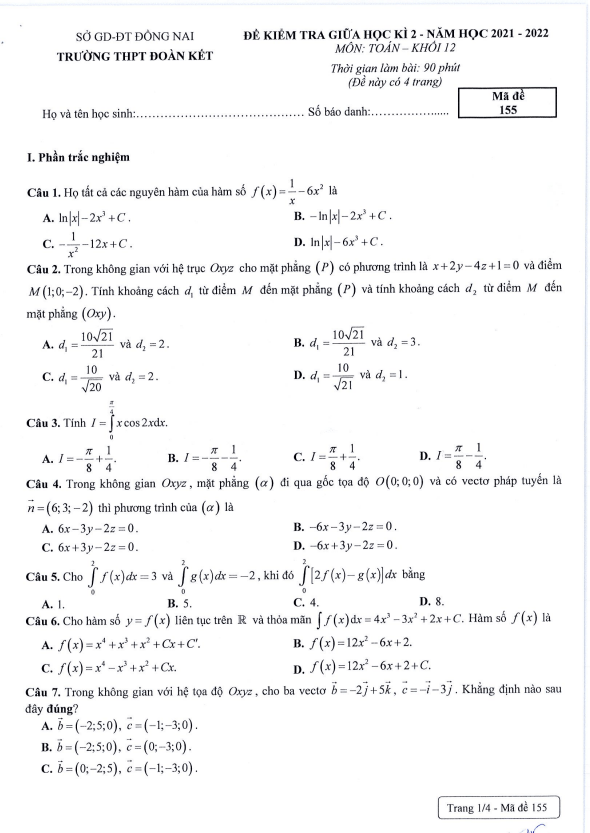 Đề kiểm tra giữa học kì 2 môn Toán lớp 12 năm học 2021 – 2022 trường THPT Đoàn Kết Đồng Nai