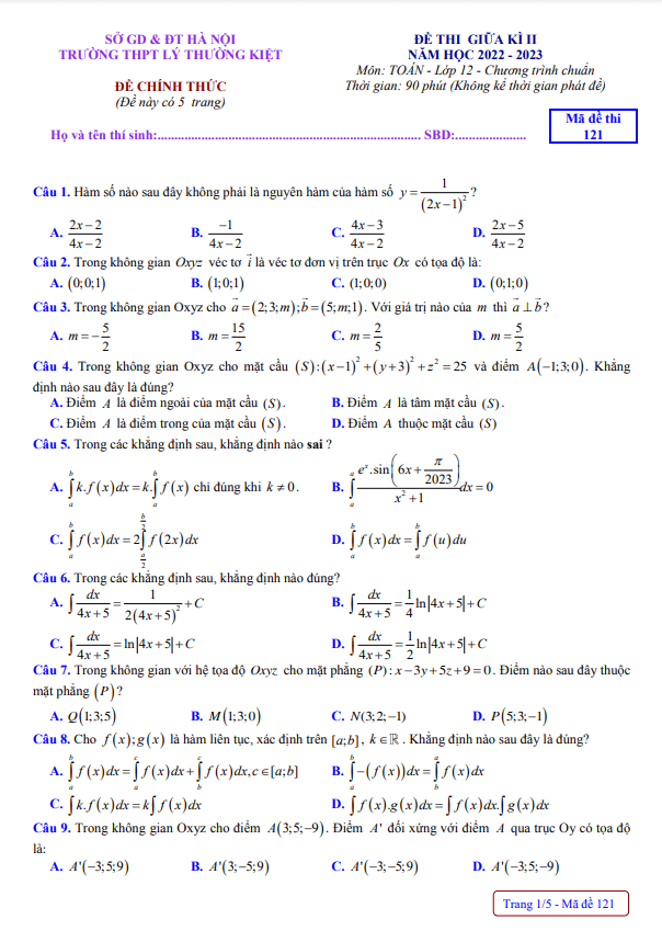 Đề thi giữa học kì 2 (HK2) lớp 12 môn Toán năm 2022 2023 trường THPT Lý Thường Kiệt Hà Nội