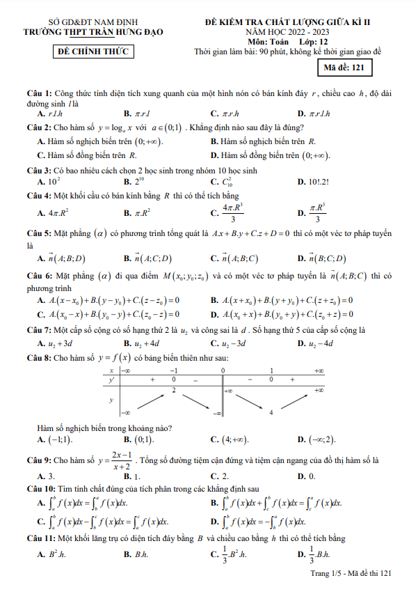 Đề thi giữa học kì 2 môn Toán lớp 12 năm 2022-2023 của trường THPT Trần Hưng Đạo Nam Định là một bước kiểm tra quan trọng để đánh giá kiến thức, kỹ năng của học sinh trong môn học này. Đề thi được biên soạn chặt chẽ theo hình thức trắc nghiệm với tổng cộng 50 câu hỏi và bài toán, đòi hỏi học sinh phải chú ý và suy nghĩ kỹ lưỡng để đưa ra đáp án chính xác.Một số câu hỏi trong đề thi đề cập đến các khái niệm cơ bản như tính diện tích xung quanh hình nón, hàm số logarit, hay tính chiều dài của sợi dây quấn quanh hình trụ. Ngoài ra, cũng có những câu hỏi khó hơn, đòi hỏi học sinh phải áp dụng kiến thức vào việc giải quyết bài toán phức tạp hơn.Đề thi có thời gian làm bài là 90 phút, đủ để học sinh có thời gian tính toán và trả lời các câu hỏi. Đề thi cũng có đáp án cụ thể theo mã đề, giúp học sinh tự kiểm tra và đánh giá lại kết quả của mình sau khi hoàn thành bài thi.Với sự chuẩn bị kỹ lưỡng và nỗ lực hết mình, học sinh sẽ vượt qua được thách thức của đề thi giữa kì 2 môn Toán lớp 12 và đạt được kết quả tốt nhất. Chúc các em học sinh của trường THPT Trần Hưng Đạo Nam Định thi tốt!