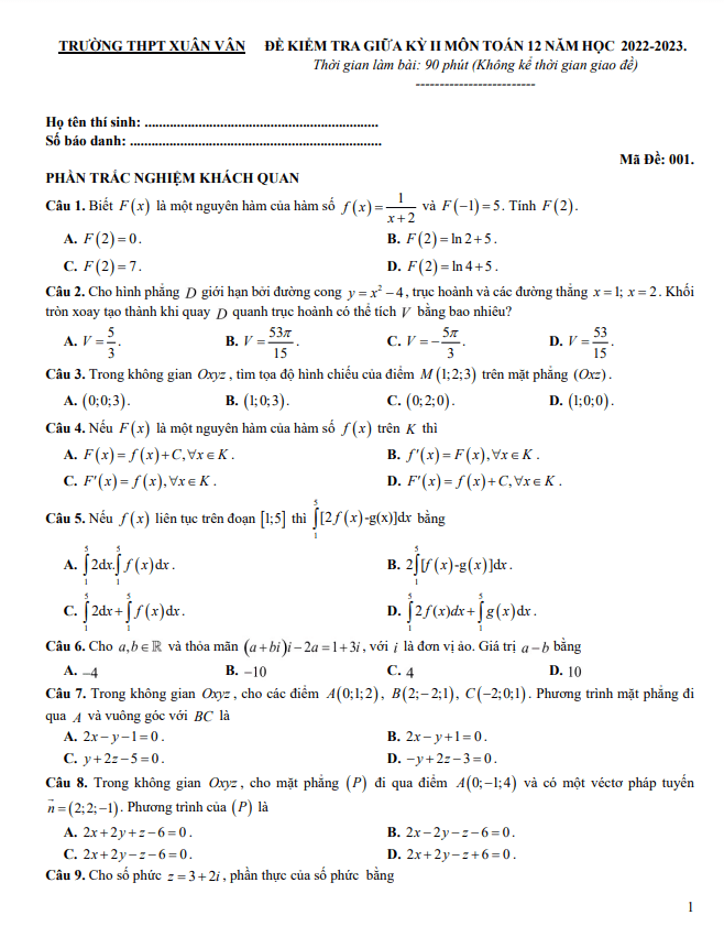 Đề thi giữa học kỳ 2 (HK2) năm 2022-2023 môn Toán lớp 12 trường THPT Xuân Vân, Tuyên Quang