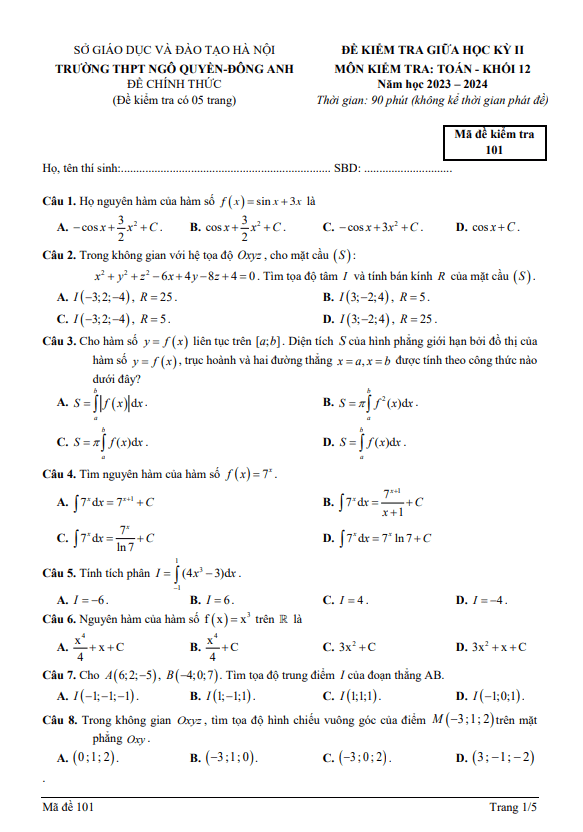Sytu xin chân thành giới thiệu đến quý thầy cô giáo và các em học sinh lớp 12 đề kiểm tra giữa học kỳ 2 môn Toán lớp 12 năm học 2023 – 2024 trường THPT Ngô Quyền, huyện Đông Anh, thành phố Hà Nội. Đề thi gồm 05 trang với 50 câu trắc nghiệm, thời gian làm bài 90 phút, có đáp án mã đề 101 102 103 104 105 106 107 108.