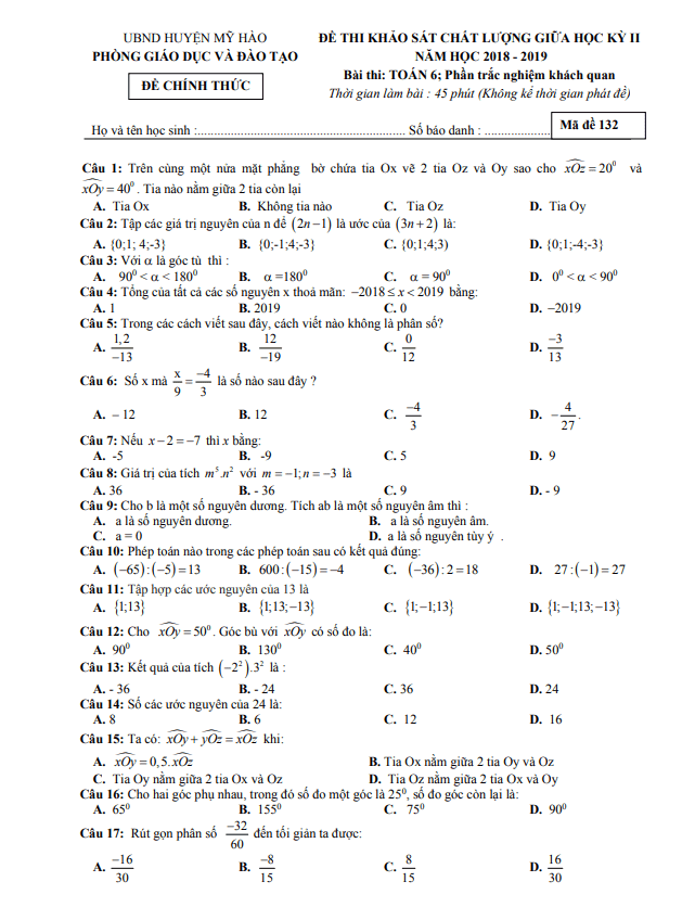 Đề thi giữa học kỳ 2 Toán lớp 6 năm 2018 – 2019 phòng GD&ĐT Mỹ Hào – Hưng Yên