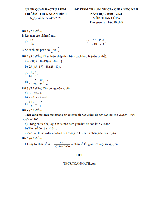 Đề thi giữa học kì 2 (HK2) lớp 6 Toán năm 2020 – 2021 trường THCS Xuân Đỉnh Hà Nội