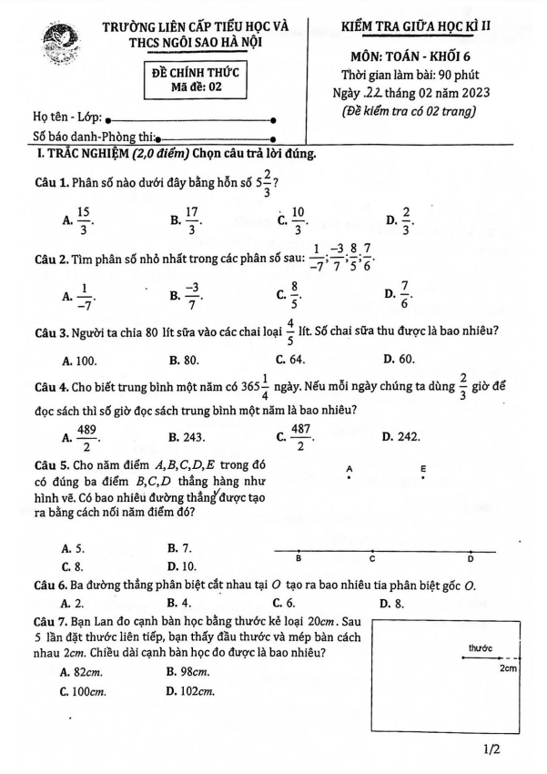 Xin chào quý thầy, cô giáo và các em học sinh lớp 6! Đây là đề thi chính thức kiểm tra giữa học kì 2 môn Toán năm học 2022-2023 của trường TH & THCS Ngôi Sao Hà Nội. Đề thi sẽ bao gồm 20% câu hỏi trắc nghiệm và 80% câu hỏi tự luận (theo điểm số), thời gian làm bài là 90 phút.