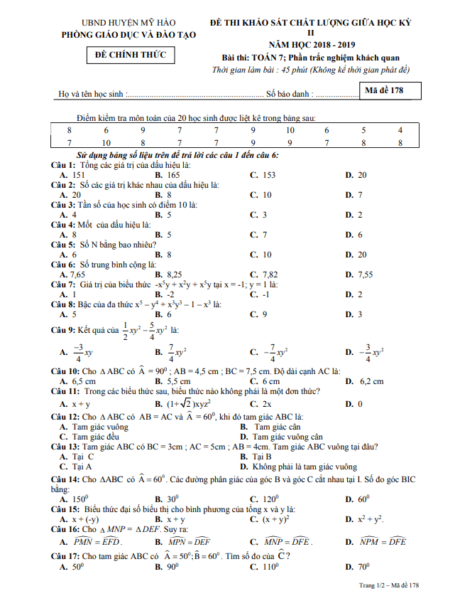 Đề thi giữa học kỳ 2 Toán lớp 7 năm 2018 – 2019 phòng GD&ĐT Mỹ Hào – Hưng Yên là đề thi được biên soạn theo hình thức trắc nghiệm khách quan kết hợp với tự luận. Đề thi bao gồm 25 câu trắc nghiệm khách quan và 04 câu tự luận, thời gian làm bài là 90 phút. Để giúp học sinh ôn tập và kiểm tra kiến thức của mình, đề thi cung cấp đáp án trắc nghiệm cùng lời giải chi tiết cho phần tự luận.