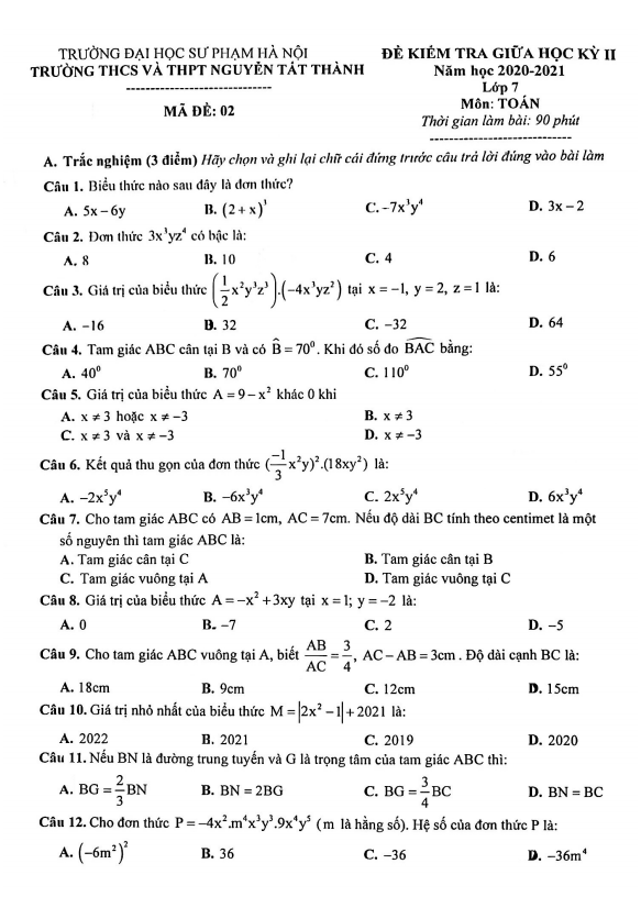 Đề thi giữa học kì 2 (HK2) lớp 7 môn Toán năm 2020 2021 trường Nguyễn Tất Thành Hà Nội