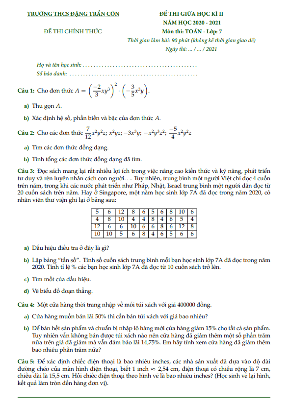 Chúng ta hãy cùng tìm hiểu đề thi giữa học kì 2 môn Toán lớp 7 năm học 2020 – 2021 tại trường THCS Đặng Trần Côn, thành phố Hồ Chí Minh.