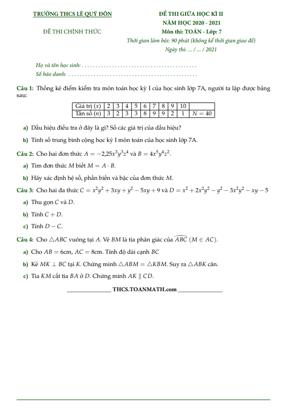 Trích dẫn đề thi giữa học kì 2 môn Toán lớp 7 năm 2020-2021 trường THCS Lê Quý Đôn – TP HCM: