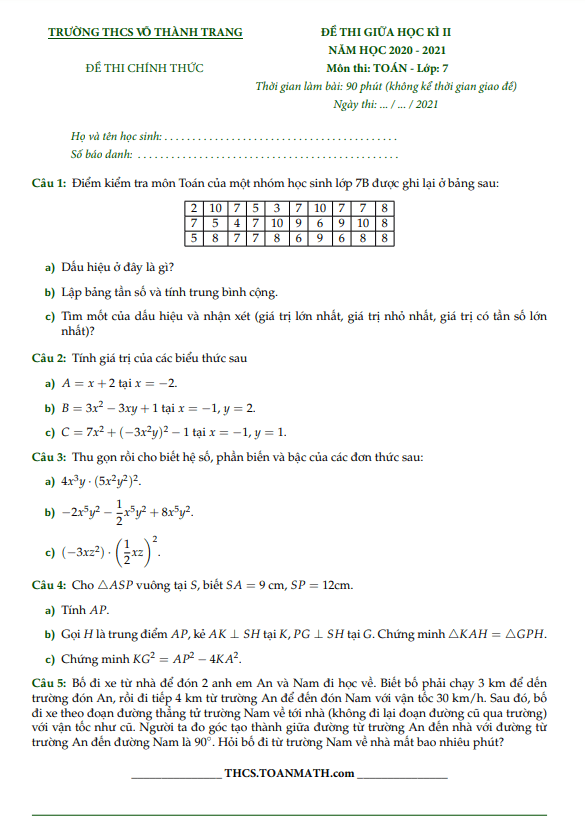 Trích dẫn đề thi giữa học kì 2 Toán lớp 7 năm 2020-2021 trường THCS Võ Thành Trang TP HCM: