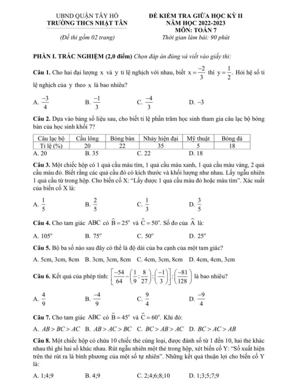 Đề thi giữa học kì 2 (HK2) lớp 7 môn Toán năm 2022 2023 trường THCS Nhật Tân Hà Nội