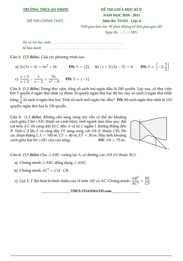 Đề thi giữa học kì 2 (HK2) lớp 8 môn Toán năm 2020-2021 Trường THCS An Nhơn TP HCM