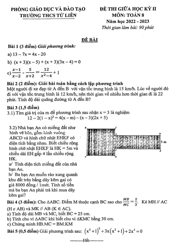 Đề thi giữa học kì 2 (HK2) lớp 8 môn Toán năm 2022 – 2023 trường THCS Tứ Liên Hà Nội