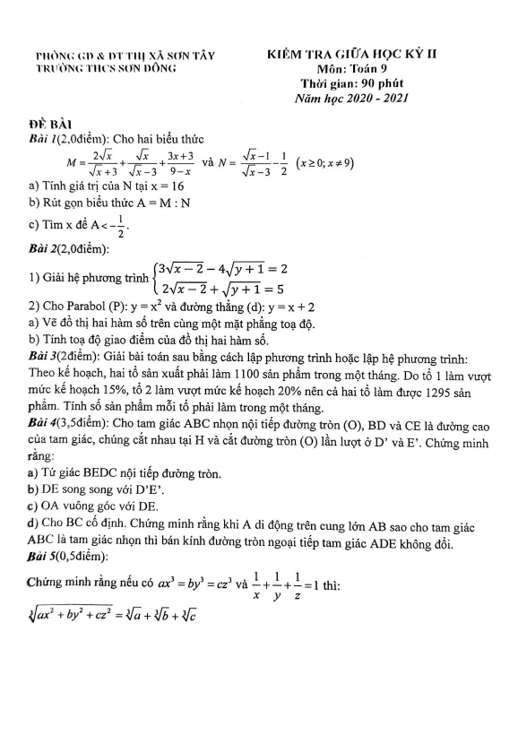 Đề thi giữa học kì 2 Toán lớp 9 năm 2020-2021 trường THCS Sơn Đông Hà Nội