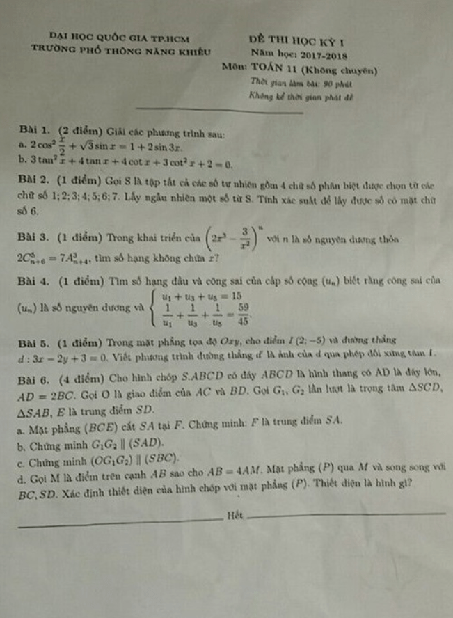 Đề thi HKI Toán lớp 11 không chuyên năm học 2017 – 2018 trường Phổ Thông Năng Khiếu – TP. HCM