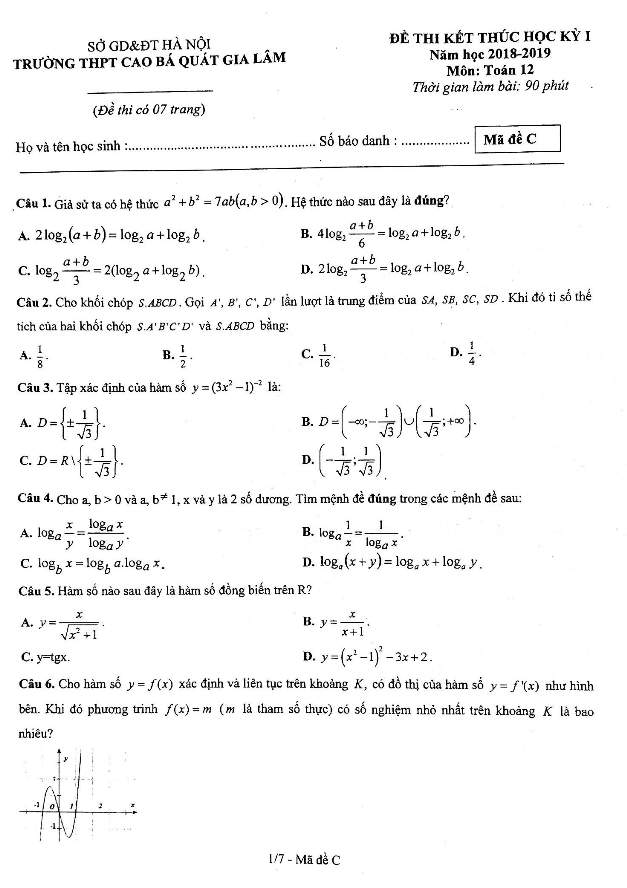 Đề thi HKI môn Toán lớp 12 năm 2018 – 2019 trường Cao Bá Quát Gia Lâm Hà Nội