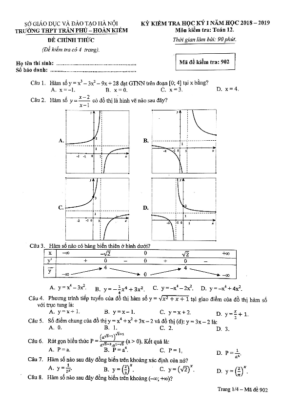 Đề thi HKI Toán lớp 12 năm học 2018 – 2019 trường THPT Trần Phú – Hoàn Kiếm – Hà Nội