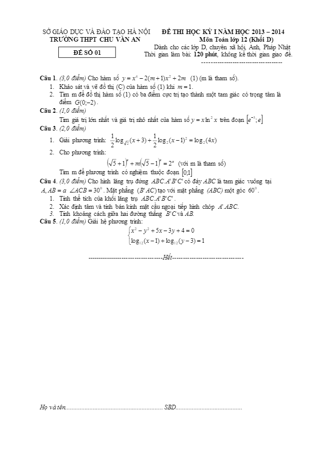 Đề thi học kỳ 1 (HK1) lớp 10 ban cơ bản trường Chu Văn An Hà Nội 2013 – 2014